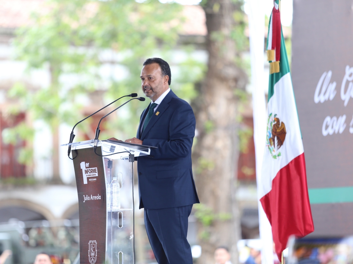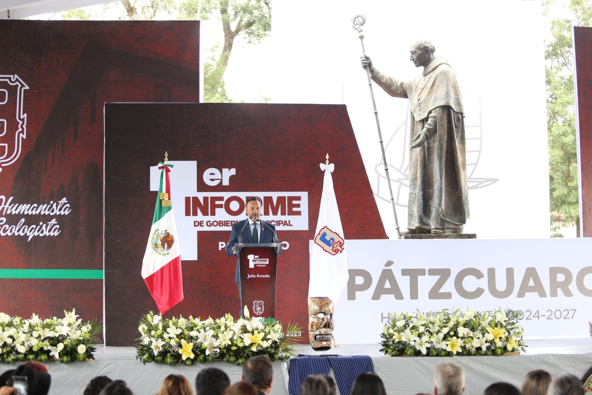 Pátzcuaro, Michoacán, 8 de agosto de 2025.- El presidente municipal Julio Arreola presentó su Primer Informe de Gobierno de este segundo periodo 2024-2027, con una Plaza Vasco de Quiroga llena de ciudadanos, reafirmando que en Pátzcuaro el poder se ejerce siempre en beneficio de la gente y con resultados palpables.
