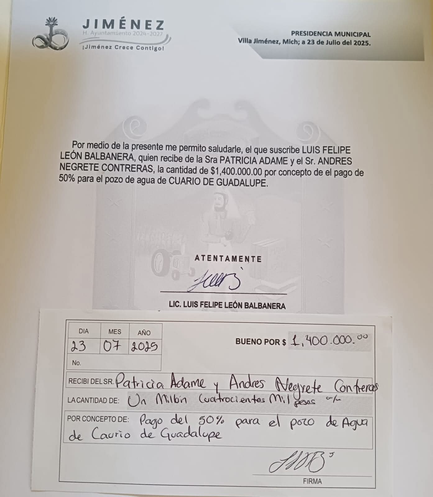 El dinero —reunido por la comunidad a través de Patricia Adame y Andrés Negrete Contreras— no fue ingresado a las arcas municipales, como exige la ley, y carece de un contrato o convenio oficial que respalde la operación. Únicamente existe un documento membretado y un recibo simple como comprobantes. La desconfianza no es nueva. Habitantes recuerdan que, cuando León Balbanera fue presidente municipal de Zacapu, solicitó un millón 300 mil pesos para un pozo que supuestamente beneficiaría a Vista Hermosa y Las Cabras, obra que nunca se concretó. Ese antecedente ha encendido focos rojos en Jiménez.