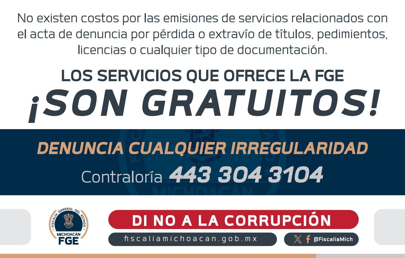 En caso de presenciar o ser víctima de un hecho contrario a la instrucción, podrá denunciarlo ante la Contraloría Interna al teléfono 443 304 3104, al correo electrónico contraloria@fiscaliamichoacan.gob.mx, o bien hacerlo en línea en https://contraloria.fiscaliamichoacan.gob.mx/denuncia.