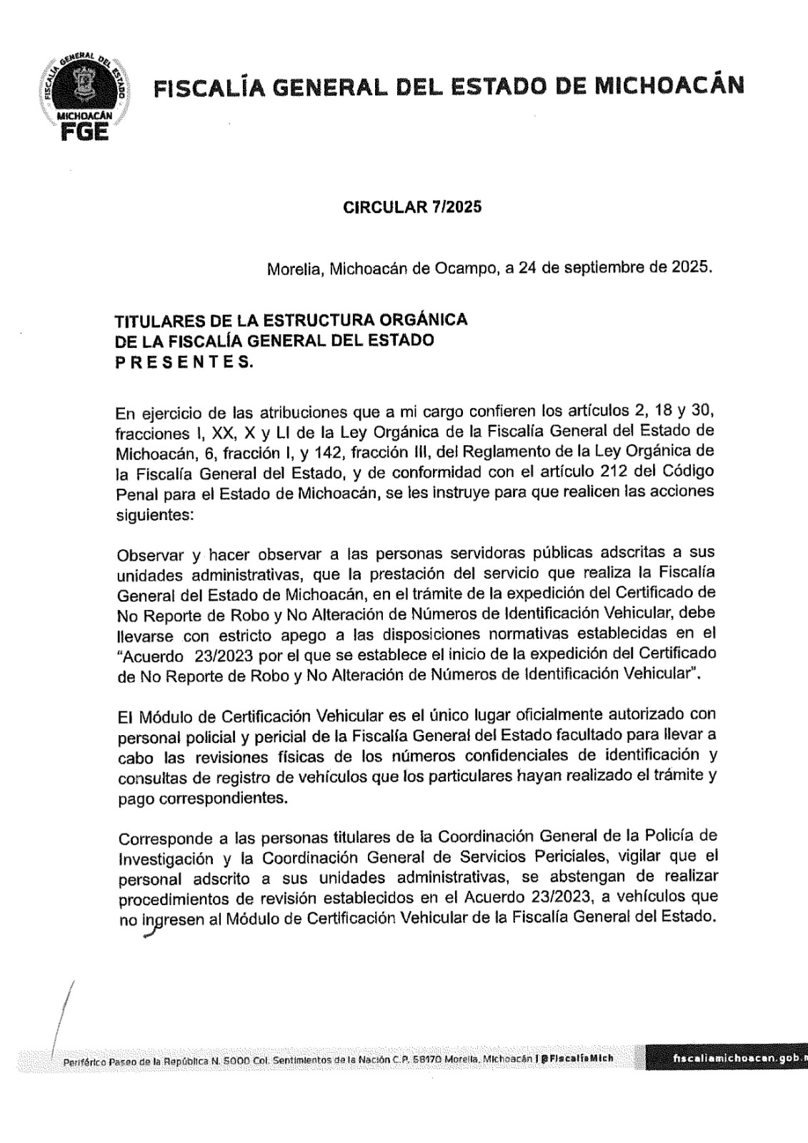 Morelia, Michoacán, 29 de septiembre de 2025.- El Fiscal General del estado de Michoacán, Carlos Torres Piña, emitió la circular 7/2025, con la cual se prohíben las revisiones de los números de identificación de vehículos fuera de instalaciones oficiales.