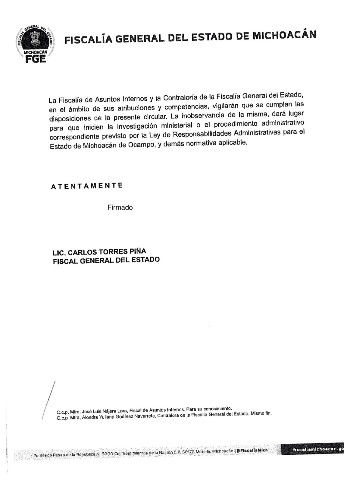 Asimismo, el Fiscal General puntualizó que la Fiscalía de Asuntos Internos y la Contraloría de la FGE, serán las encargadas de supervisar el cumplimiento de la disposición. En caso de inobservancia, se iniciarán investigaciones ministeriales necesarias o procedimientos administrativos conforme a la Ley de Responsabilidades Administrativas para el Estado de Michoacán.