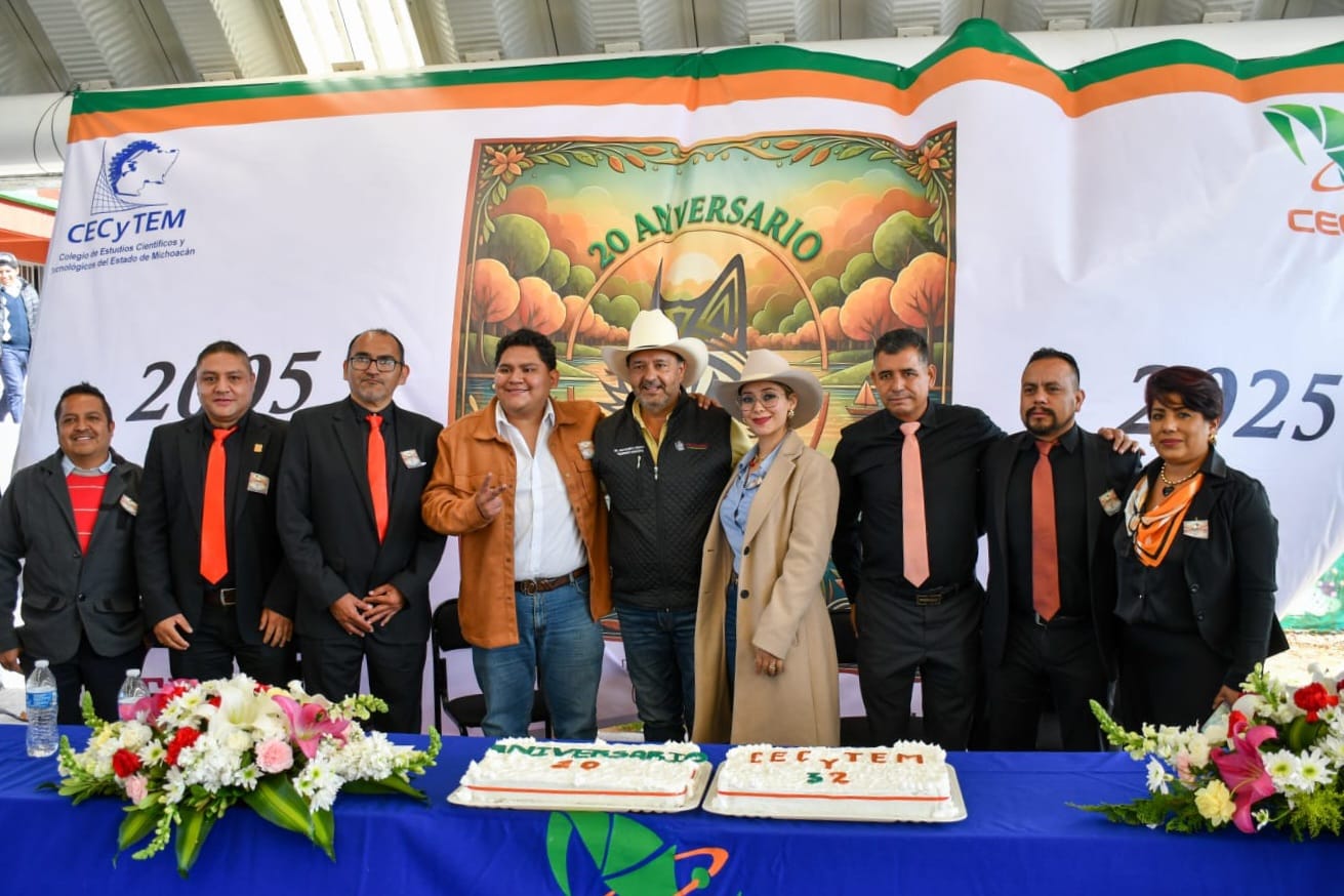 Pátzcuaro, Michoacán, a 5 de diciembre de 2025.- El presidente municipal Julio Arreola encabezó la ceremonia del 20 aniversario del CECyTEM Plantel 32 Huecorio, donde reconoció el esfuerzo educativo de docentes, personal administrativo y estudiantes que, durante dos décadas, han contribuido a la formación de jóvenes con valores, disciplina y sentido de identidad comunitaria.