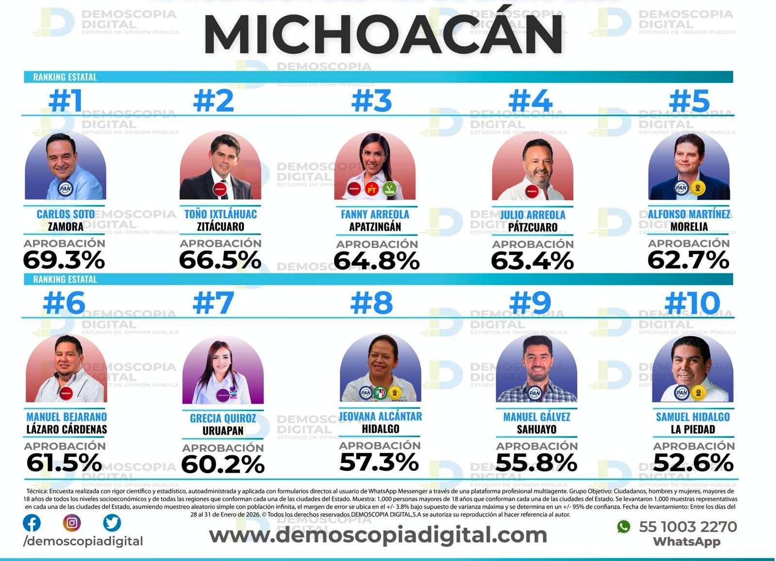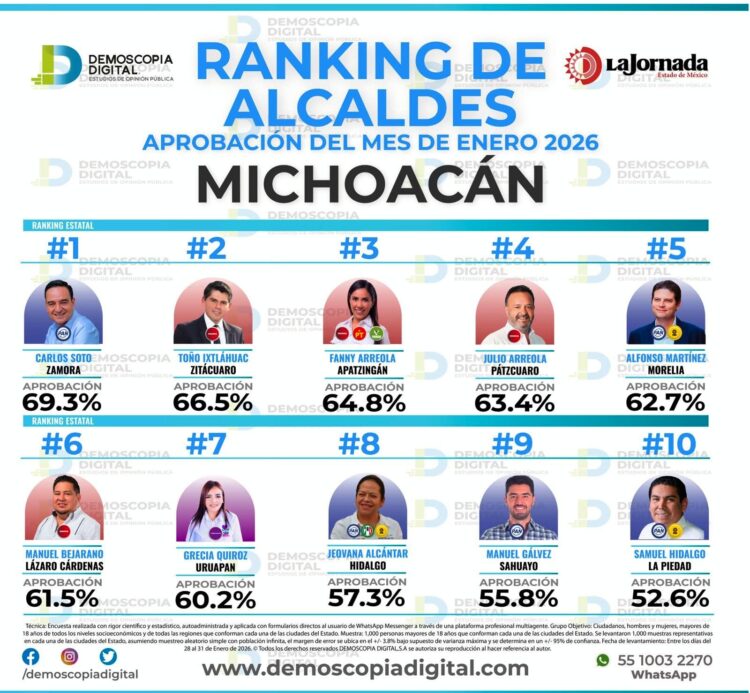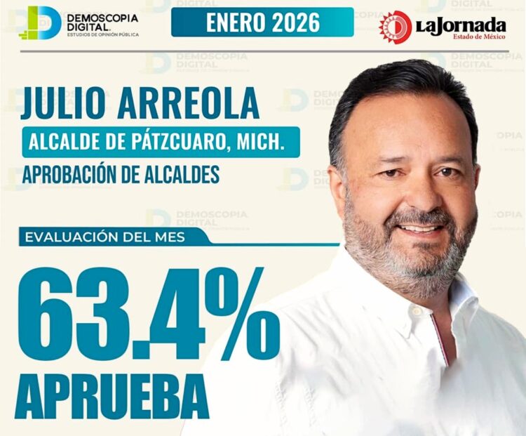 Morelia, Michoacán, 6 de febrero de 2026.- El presidente municipal de Pátzcuaro, Julio Arreola, se posicionó entre los alcaldes mejor evaluados de Michoacán, de acuerdo con el Ranking de Aprobación correspondiente al mes de enero de 2026, elaborado por la casa encuestadora Demoscopía Digital y difundido por La Jornada Estado de México.
