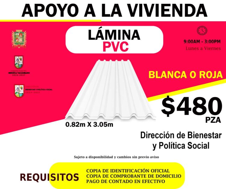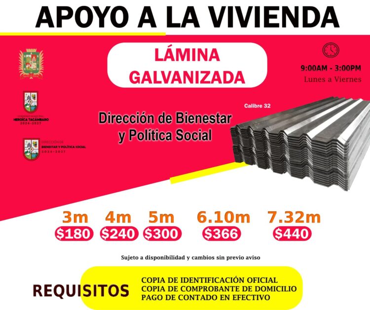 Tacámbaro, Mich; Febrero del 2026.- El Gobierno Municipal, que preside Alejandro Fuerte García, a través de la Dirección de Bienestar y Política Social, impulsa el programa de apoyo con lámina galvanizada y lámina pvc para fortalecer las viviendas de las familias que más lo necesitan en nuestro municipio.